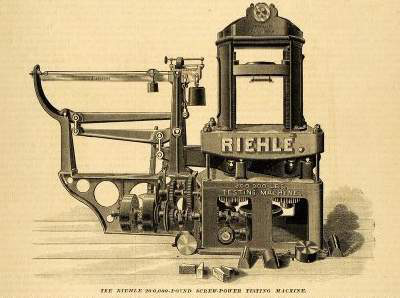 在中國,杠桿式拉伸試驗機被引進(jìn)大概是在上世紀(jì)初,同濟(jì)大學(xué)建設(shè)初期,引進(jìn)一臺同濟(jì)編號為:440001的杠桿式拉伸試驗機(圖二),目前,存放于同濟(jì)大學(xué)力學(xué)試驗中心。這臺試驗機上同時標(biāo)有“RIEHLE BRCXPHILA16494”(圖三)的小字,通過檢索,發(fā)現(xiàn)這臺試驗機是由位于美國費城的理勒兄弟測試機械公司(Riehle Brothers Testing machines Company)生產(chǎn)。